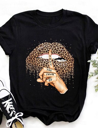 Mulheres Camiseta Leopardo Boca Moda Moderno Casual Manga Curta Gola Redonda Tops regulares Diário Final de semana Preto Verão