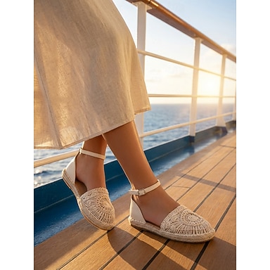 Sandálias espadrille femininas bege de crochê com salto anabela e tiras elásticas – calçado elegante e confortável para férias na praia – perfeitas para escapadelas de verão e dias casuais.