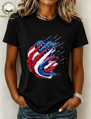 Dia da Independência Americana Mulheres Camiseta Imprimir Gráfico Letra Bandeira americana à moda Clássico Casual Manga Curta Gola Redonda Tops regulares Diário Preto Verão Primavera