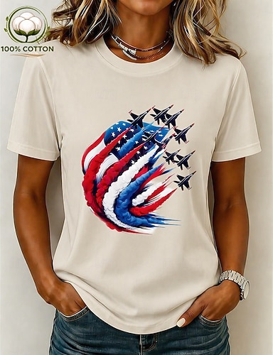 Dia da Independência Americana Mulheres Camiseta Imprimir Gráfico Bandeira Letra Vintage Moda à moda Manga Curta Decote Redondo Tops regulares Casual Diário Final de semana Azul Preto Branco Cinzento