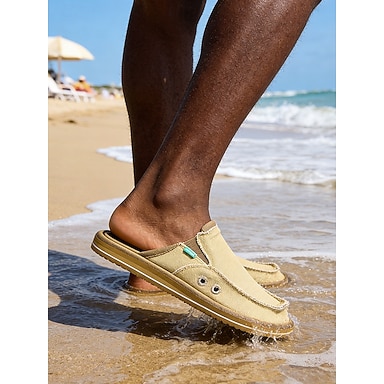 Mocassins masculinos bege, sem fecho, com tira ajustável, macios e leves, perfeitos para férias na praia, viagens e momentos de lazer.
