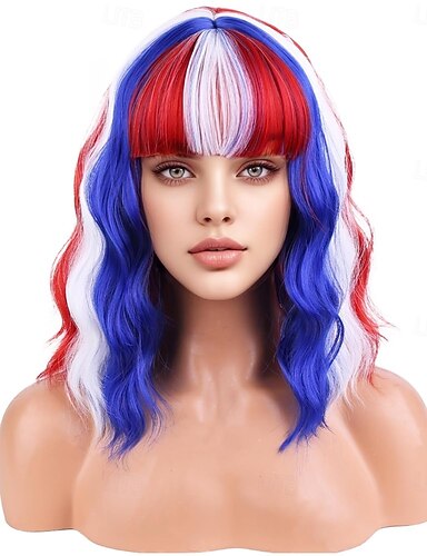 Peruca de Bandeira do Quatro de Julho para Mulheres Perucas Curtas Cacheadas Vermelha Branca e Azul para Fantasia e Festa do Dia da Independência
