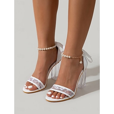 Sandálias de noiva femininas brancas de renda, com salto bloco transparente e bico aberto, com detalhe de laço, ideais para casamentos e cerimônias. &recepção