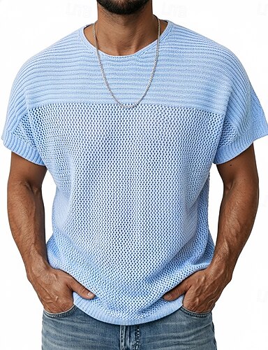 Homens camiseta de tricô T-shirt Manga Curta Gola Redonda Verão Tecido Roupa de Malha Moda Diário Vazado Casual Ao ar livre Streetwear Azul Preto Branco Top Tee para Homens