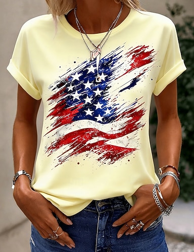 Dia da Independência Americana Mulheres Camiseta T-shirt Imprimir Gráfico Moda Básico Casual Manga Longa Gola Redonda Tops regulares Diário Para Noite Final de semana Amarelo Verão Primavera Outono