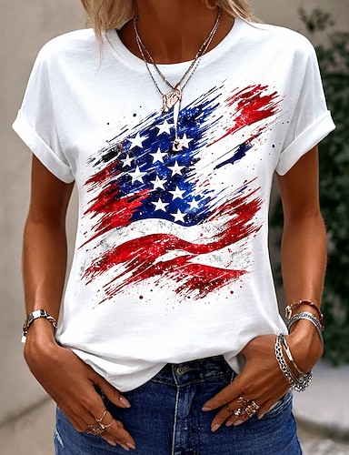 Dia da Independência Americana Mulheres Camiseta T-shirt Imprimir Gráfico Bandeira americana à moda Clássico Casual Manga Curta Decote V Tops regulares Diário Para Noite Final de semana Azul Vermelho