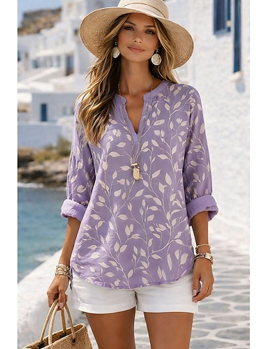 Mulheres Camisa Social camisa Boho Blusa Imprimir Floral Gráfico Vintage Diário à moda Manga Longa Decote V Tops regulares Diário Feriado Azul Amarelo Rosa Roxo Cáqui Verão Primavera