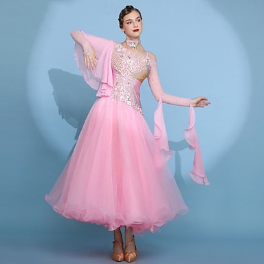 Vestido de dança de salão feminino, vestido de competição elegante para dança de salão, com strass rosa claro, em camadas de organza, valsa, tango, foxtrote