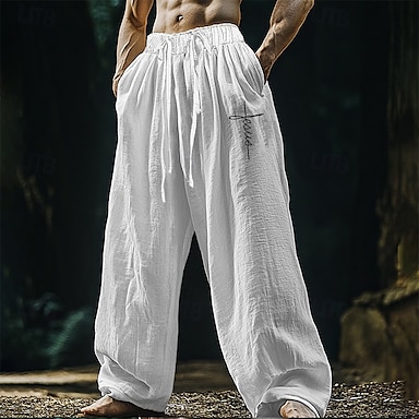 Homens Calças de linho Calças Calça verão Calças de praia Bolsos Cintura elástica Com Cordão Tecido Conforto Respirável Férias Diário Feriado Havaiana Boho Preto Branco
