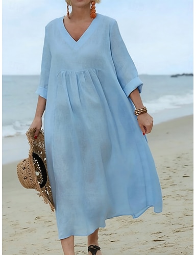 Mulheres Vestido Longo Linho de algodão sintético Vestido Kaftan Vestido casual Elegante Moda Moderno Ao ar livre Férias Para Noite Ajuste Largo Tecido Manga Longa Decote V Azul Amarelo Verde Verão