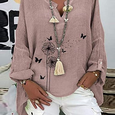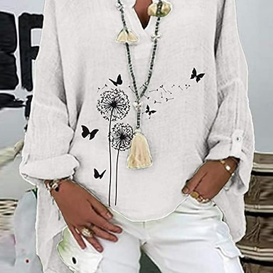 Mulheres Camisas de algodão e linho Linho de algodão sintético Imprimir Margarida Básico Casual Manga Longa Colarinho de Camisa Tops regulares Diário Rosa Azul Marinha Roxo Verde Verão Outono