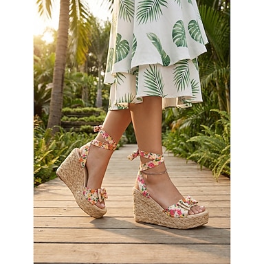 Sandálias femininas românticas rosa com estampa floral e salto anabela - confortáveis espadrilles com tiras de amarrar no tornozelo. &Detalhe de laço para resorts ao ar livre, férias de verão &festas