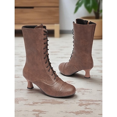 Botas femininas eduardianas de couro sintético marrom com cadarço, botinhas vintage de salto médio dos anos 1950 para fantasias, teatro e uso diário retrô
