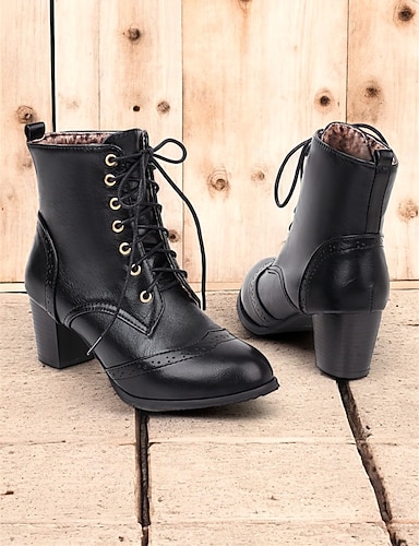 Botas de cano curto estilo brogue, marrons, com cadarço, em couro sintético, bico redondo e salto, perfeitas para looks retrô, uso diário e moda outono/inverno.