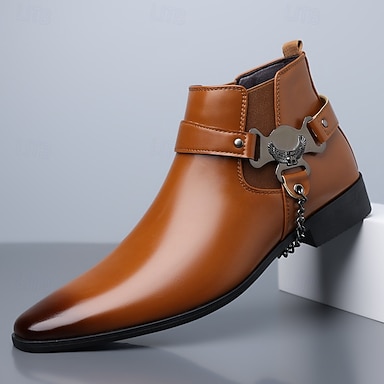 Botas masculinas de couro sintético bege com detalhe de fivela – calçados elegantes e duráveis para eventos casuais e semiformais