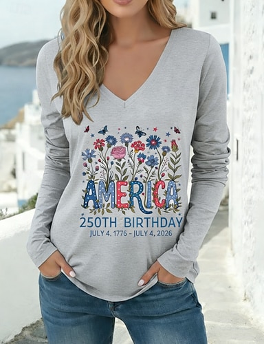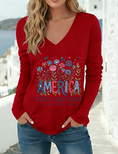 Dia da Independência Americana Mulheres Camiseta T-shirt Imprimir Gráfico Bandeira americana à moda Clássico Casual Manga Longa Decote V Tops regulares Diário Para Noite Final de semana Azul Vermelho