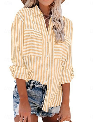 Mulheres camisa de verão Camisa casual Blusa Bolsos Botões Imprimir Listrado Férias à moda Casual Manga Longa Aberto para a Lateral Colarinho de Camisa Tops regulares Diário Ao ar livre Feriado Azul