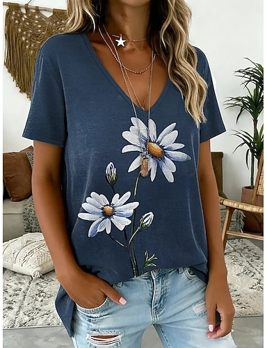 Mulheres Camiseta Imprimir Floral Gráfico Vintage à moda Clássico Manga Curta Decote V Tops regulares Diário Ginásio Para Noite Azul Verão Primavera