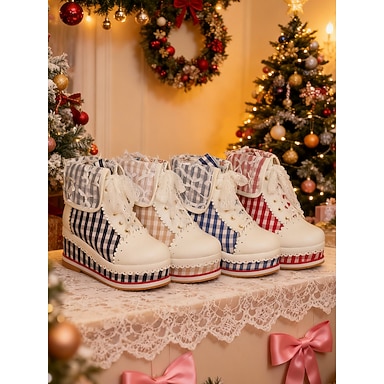 Botas femininas vermelhas de plataforma com cadarço e estampa xadrez vichy – um adorável estilo retrô com detalhes em renda e padrão xadrez, perfeitas para o Natal, o estilo lolita e as festas de inverno.