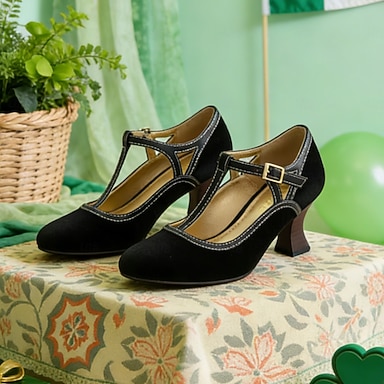 Sapatos femininos vintage elegantes dos anos 1950, pretos, com tiras cruzadas no calcanhar – estilo retrô, confortáveis e com salto baixo, ideais para eventos noturnos e ocasiões formais.