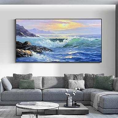 Pintura a óleo pintada à mão na parede azul oceano nascer do sol pintura de paisagem decoração de casa decoração lona enrolada sem moldura não esticada