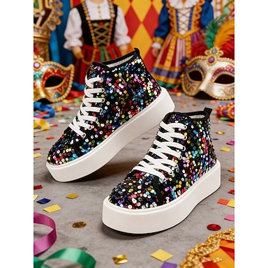 Tênis Altos Pretos com Lantejoulas Coloridas Femininos de Mardi Gras - Sapatos Trendy para Festivais de Carnaval Desfiles e Festas de Rua