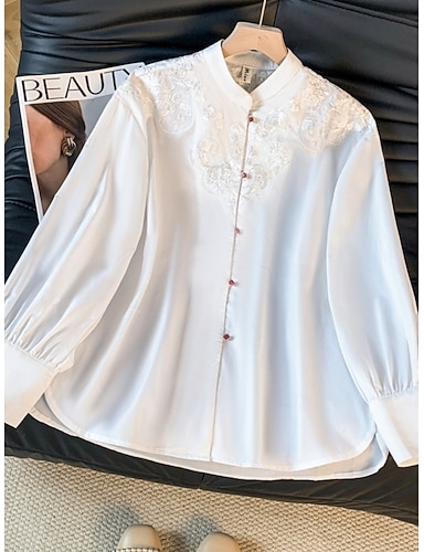 Mulheres Camisa Social Blusa Blusas de manga comprida Bordado Tecido à moda Clássico Moderno Manga Longa Colarinho Chinês Tops regulares Diário Feriado Para Noite Branco Verão Primavera