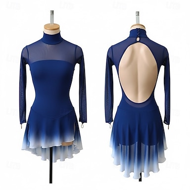 Vestidos para Patinação Artística Mulheres Para Meninas Patinação no Gelo Vestidos Azul Patchwork Thumbhole Elastano Com Transparência Elasticidade Alta Treino Competição Roupa para Patinação