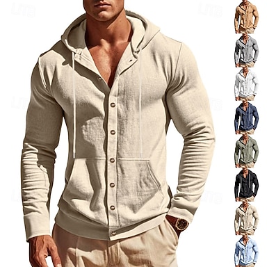 Homens Camisa Social camisa de verão Camisa casual camisa de praia camisa de botão Preto Branco Amarelo Azul Marinha Caqui Manga Longa Côr Sólida Com Capuz Férias Casual Com Cordão Roupa Moda Casual