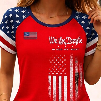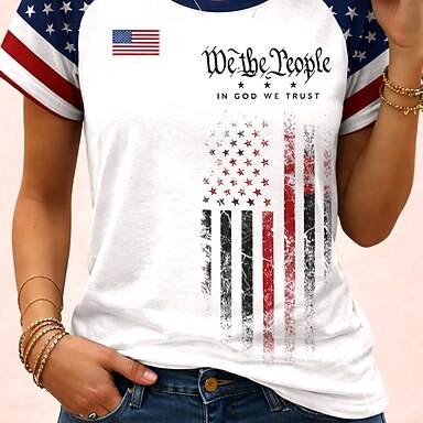 Dia da Independência Americana Mulheres Camiseta Imprimir Gráfico Bandeira Vintage à moda Clássico Manga Curta Decote V Tops longos Diário Final de semana Roupas de férias Azul Preto Verão Primavera