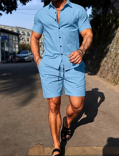 Homens Camisa Social Conjunto de camisa Camisa casual camisa de botão Preto Vermelho Azul Royal Azul Céu Verde Manga Curta Tecido Colarinho de Camisa Casual Diário 2 Peças Roupa Elegante Moda Casual