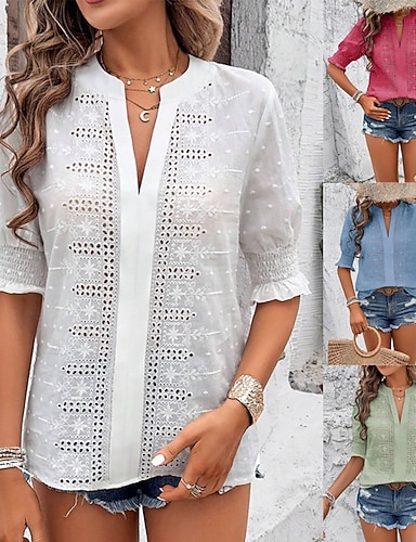 Mulheres Blusa Vazado Tecido Elegante à moda Casual Meia Manga Decote V Tops regulares Diário Feriado Para Noite Azul Branco Verde Claro Rosa cor de Rosa Verão Primavera Outono