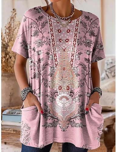 Mulheres Camiseta Imprimir Gráfico Geométrica Estampado Cashemere Vintage à moda Casual Manga Curta Gola Redonda Tops longos Diário Final de semana Rosa Verão Primavera