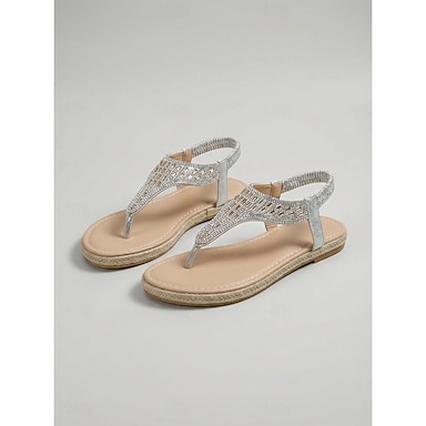 Sandálias femininas de dedo com strass prateado brilhante - sandálias rasteiras elegantes com tira em T e tira elástica no tornozelo, perfeitas para férias na praia e casamentos à beira-mar. &roupa de
