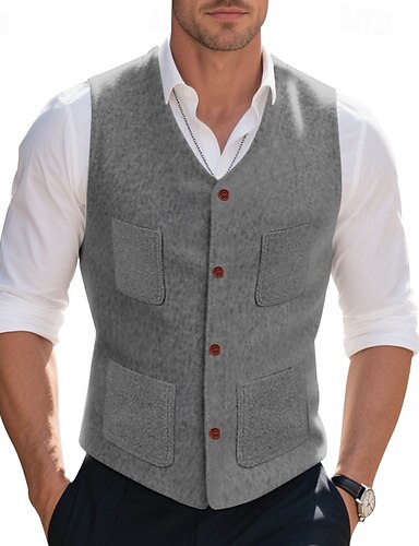 Homens Colete Gilet Férias Festa O negócio Moda Casual Primavera Outono Bolsos Botões Poliéster Confortável Tecido Comum 1 Botão Decote V Normal Preto Cinzento Colete