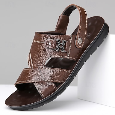Sandálias masculinas casuais de verão em couro sintético marrom, respiráveis e fáceis de calçar, ideais para férias, atividades ao ar livre e lazer diário.