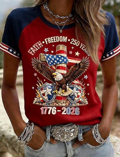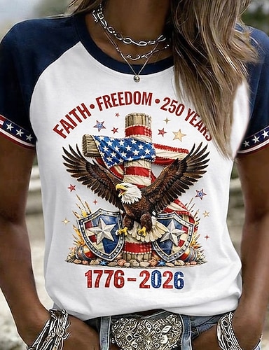 Dia da Independência Americana Mulheres Camiseta Imprimir Gráfico Bandeira à moda Clássico Casual Manga Curta Gola Redonda Tops regulares Diário Branco Verão Primavera