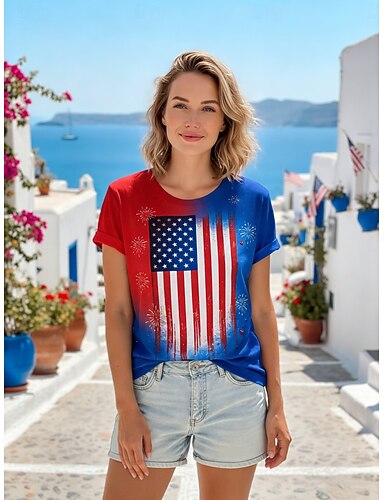 Dia da Independência Americana Mulheres Camiseta T-shirt Imprimir Gráfico à moda Clássico Casual Manga Curta Gola Redonda Tops regulares Diário Para Noite Final de semana Azul Preto Branco Vermelho
