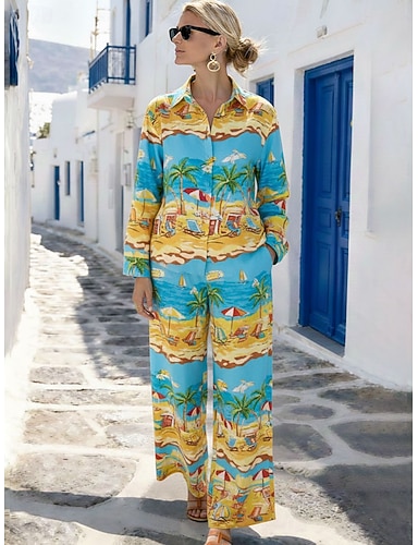 Mulheres Conjuntos de duas peças Conjuntos de calças Bolero Top Manga Longa Colarinho de Camisa Floral Gráfico Plantar Imprimir Diário à moda Casual Diário Praia Azul Amarelo Vermelho Verão Normal