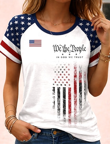Dia da Independência Americana Mulheres Camiseta Imprimir Gráfico Letra Bandeira americana à moda Clássico Casual Manga Curta Gola Redonda Tops regulares Diário Azul Verão Primavera