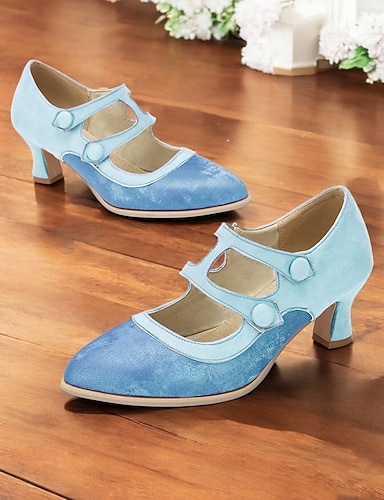 Sapatos Mary Jane femininos da década de 1950 - salto grosso, bico redondo, retrô, azul e branco, com tira, para looks vintage, chás da tarde ou uso diário