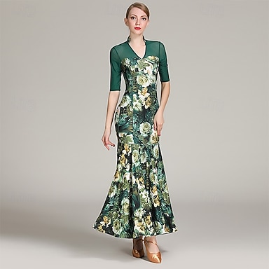 Vestido de dança de salão feminino floral verde, estilo cheongsam, com gola, detalhes em tule, mangas curtas e cauda de sereia, ideal para valsa, tango e competições.