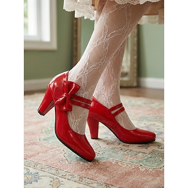 Sapatos femininos vintage dos anos 50 em verniz vermelho sintético - elegantes sapatos de salto alto estilo Mary Jane com detalhe de laço, perfeitos para festas retrô e casamentos. &estilo pin-up