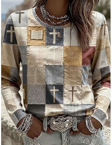 Mulheres Camiseta Imprimir Gráfico Geométrica Vintage Moda à moda Manga Longa Gola Redonda Decote Redondo Tops regulares Diário Final de semana Bege Outono Inverno