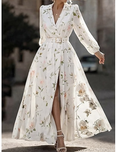 Mulheres Vestido Longo Vestido de chiffon Vestido Swing Vestido floral Vestido estampado Elegante Moda Moderno Ao ar livre Férias Para Noite Normal Floral Manga Longa Decote V Branco Verão Primavera
