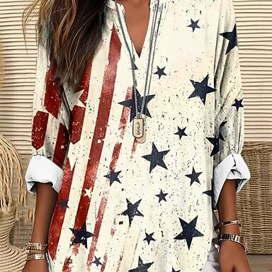 Blusa Feminina Patriótica do Dia da Independência Linho Respirável Leve Estampa Gráfica Bandeira Vintage Diária Estilosa Manga Curta Decote em V Tops Regulares Diários Feriado Vermelha Azul Verão