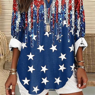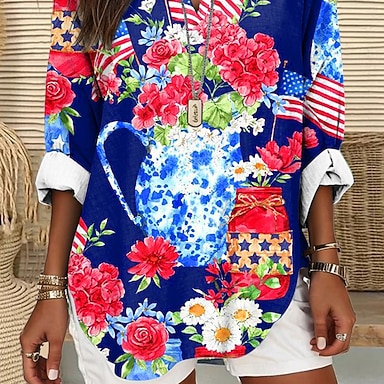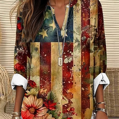 Blusa Feminina Dia da Independência Americana Linho Semelhante Respirável Leve Tunica Decote em V Manga Longa Boho Tops Casuais Gráfico Animal Bandeira Vintage Tropical Uso Diário Estampa Azul Denim