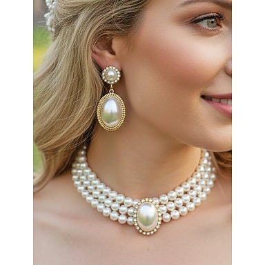 Conjunto de colar e brincos de pérolas sintéticas femininas, gargantilha vintage elegante de várias camadas com pingente oval, joia clássica para noivas, casamentos, festas noturnas e eventos formais.