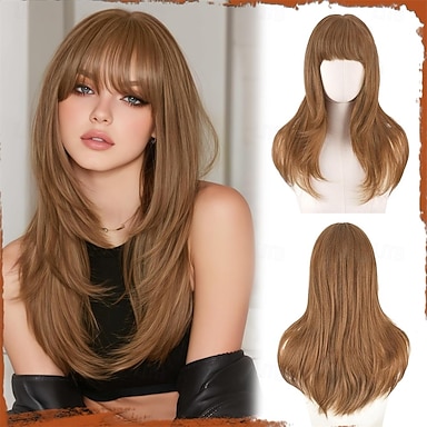 Peruca longa, lisa e em camadas, castanho-avermelhada com franja, 60 cm (24 polegadas), feita de cabelo sintético com textura natural, macia e resistente ao calor, ideal para uso diário e em festas.