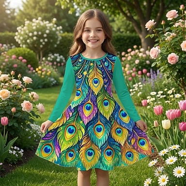 Meninas 3D Gráfico Pavão Vestido Manga Longa Impressão 3D Primavera Outono Diário Férias Festa Casual Princesa Lindo Infantil 4-12 anos Vestido casual Vestido A Line Altura dos Joelhos Normal
